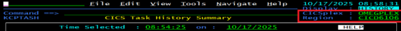 Navigating between CICS regions in the Task History (KCPTASH) workspace is now more intuitive. You can simply overtype the CICSPlex and Region fields to jump directly to the task history data of other regions, reducing the time spent on manual selection.