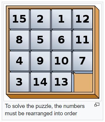 The 15 puzzle, also called Gem Puzzle, Boss Puzzle, Game of Fifteen, Mystic Square and many others, is a sliding puzzle that consists of a frame of numbered square tiles in random order with one tile missing. The puzzle also exists in other sizes, particularly the smaller 8 puzzle. If the size is 3×3 tiles, the puzzle is called the 8 puzzle or 9 puzzle, and if 4×4 tiles, the puzzle is called the 15 puzzle or 16 puzzle named, respectively, for the number of tiles and the number of spaces. The goal of the puzzle is to place the tiles in order by making sliding moves that use the empty space.