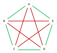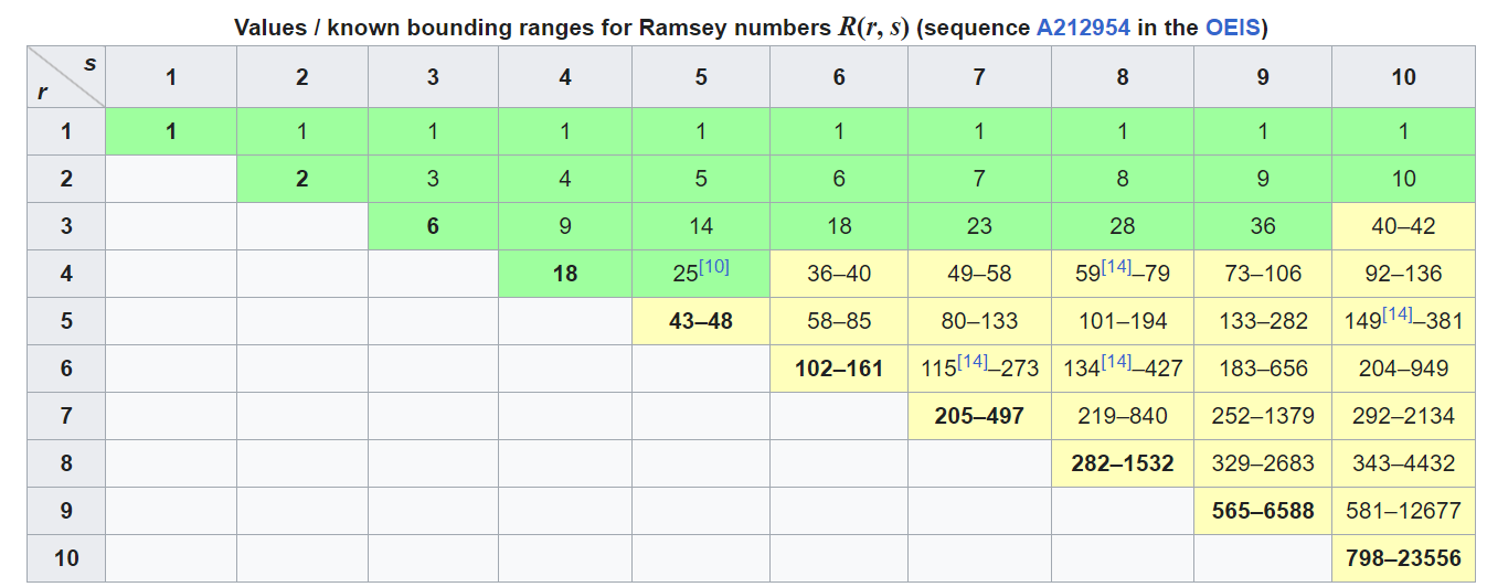 Consider an arbitrary relation graph among 6 people A, B, C, D, E and F. I can see a red triangle between A, C and E and if you change any of the line between A, C and E you get a green triangle. There is a rigorous mathematical proof available in Wikipedia but I am skipping it.In short we say R(3,3) = 6 and this is known as the Party Problem. In general, R(m,n) denotes the minimum value of k such that in any group k people always there will m people who know each other or there will be n people who do not know each other. These are called Ramsey Numbers after the British Mathematician Frank P Ramsey who proved that value of R(m,n) is finite for any choice of m and n.It is very hard to find the exact values of R(m,n) for different values of m and n. We have plans to bring in quantum computers to find them. Below is the status till today.