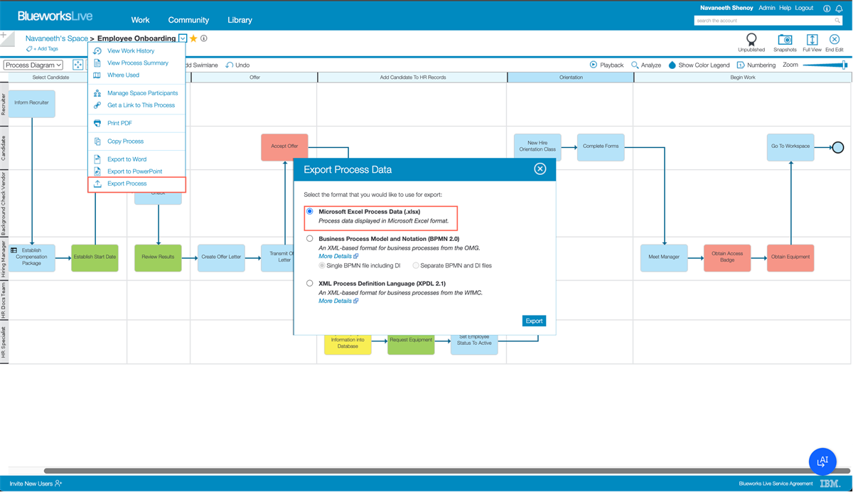 - Group Tasks by Milestones: In Blueworks Live, export your process model to Excel, where tasks will be listed under the Process Items sheet. Group these tasks based on the milestones or phases they belong to (such as "Background Check", "Offer", "Orientation", etc.).