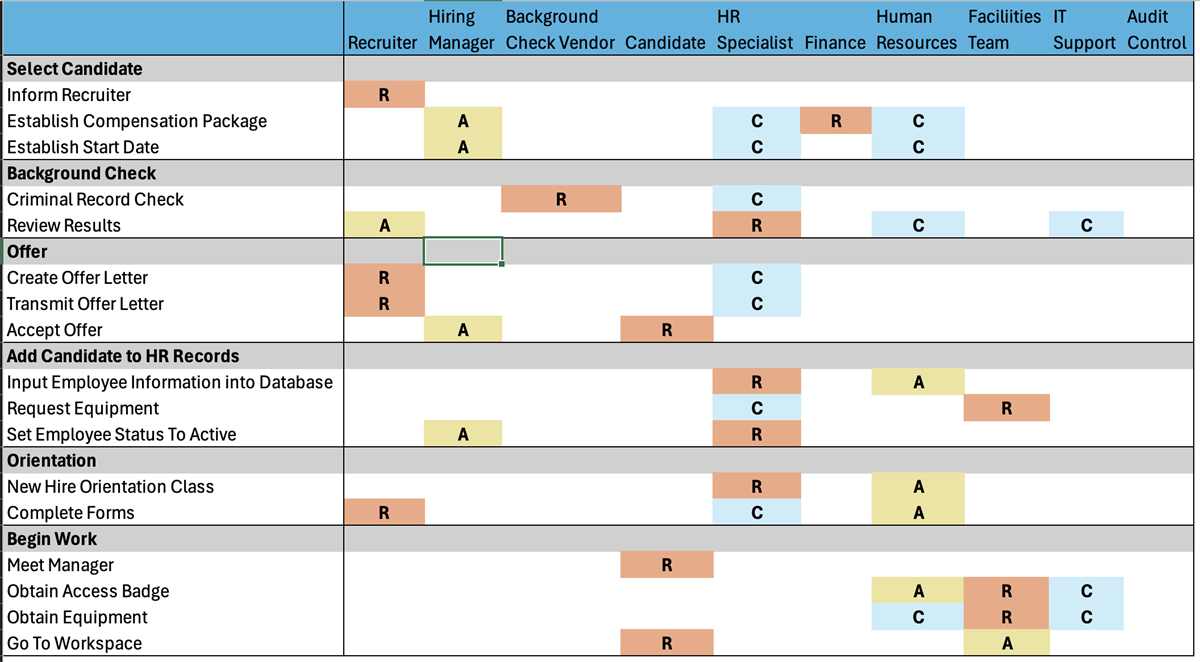 - Create the RACI Diagram: Once you’ve organized the tasks and roles in Excel, you can easily visualize the RACI chart by filling out the grid. Each task will be associated with a specific person or team for each RACI category. This method will allow you to map out the responsibilities clearly and quickly.