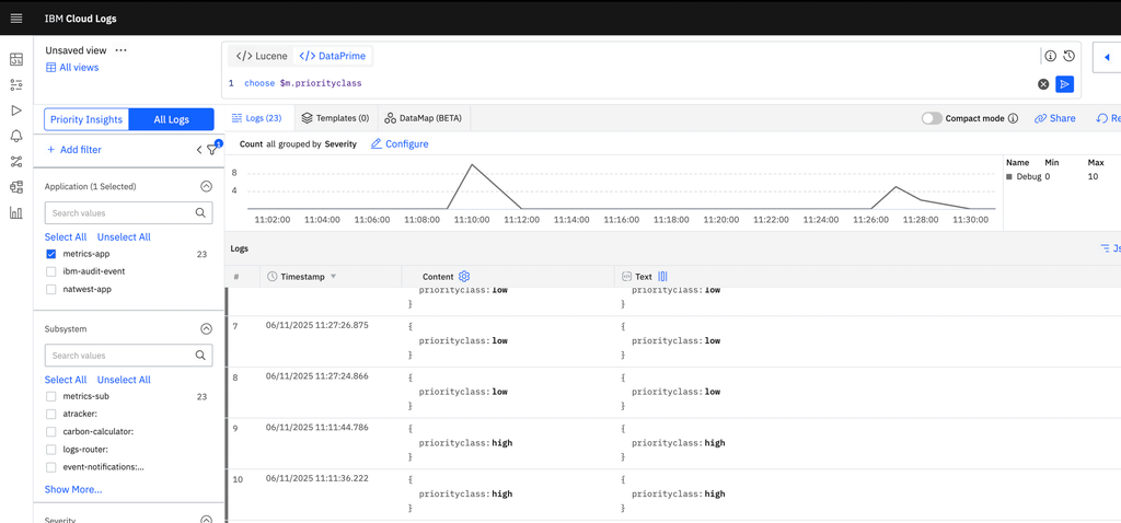 To verify your policy, run the following Data Prime query, and ensure that you select the correct application and subsystem filters in the left-hand filter panel
