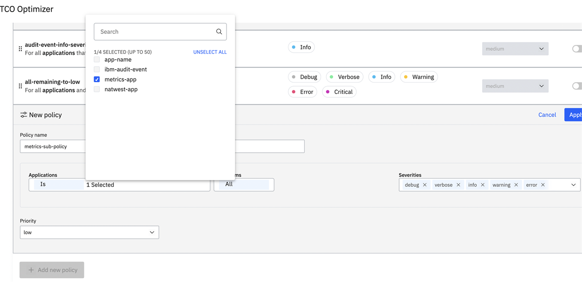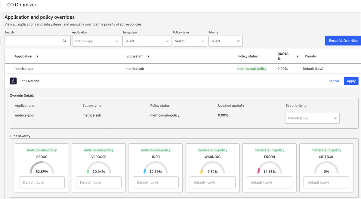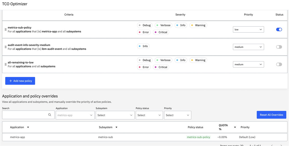 For example, to send all logs from metrics-app (including all subsystems and severities) to a lower tier, configure the policy accordingly.