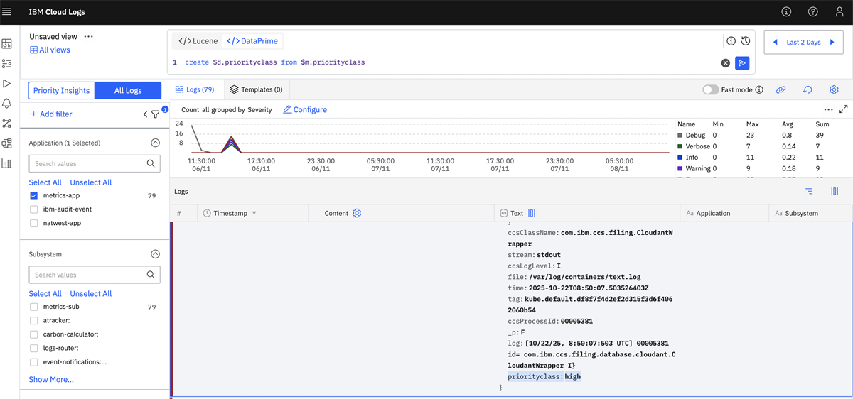This query displays the priority class (tier) assigned to each log record — for example, High, Medium, or Low. By applying the same filters or selection criteria used in your TCO policy (such as specific applications, subsystems, or severities), you can confirm whether logs are being routed to the intended tier.If the logs appear with the expected priority class, it means your TCO policy is working as configured. Conversely, if no logs are returned, this indicates that your policy may be blocking or misrouting logs, and further review of your rules is needed.