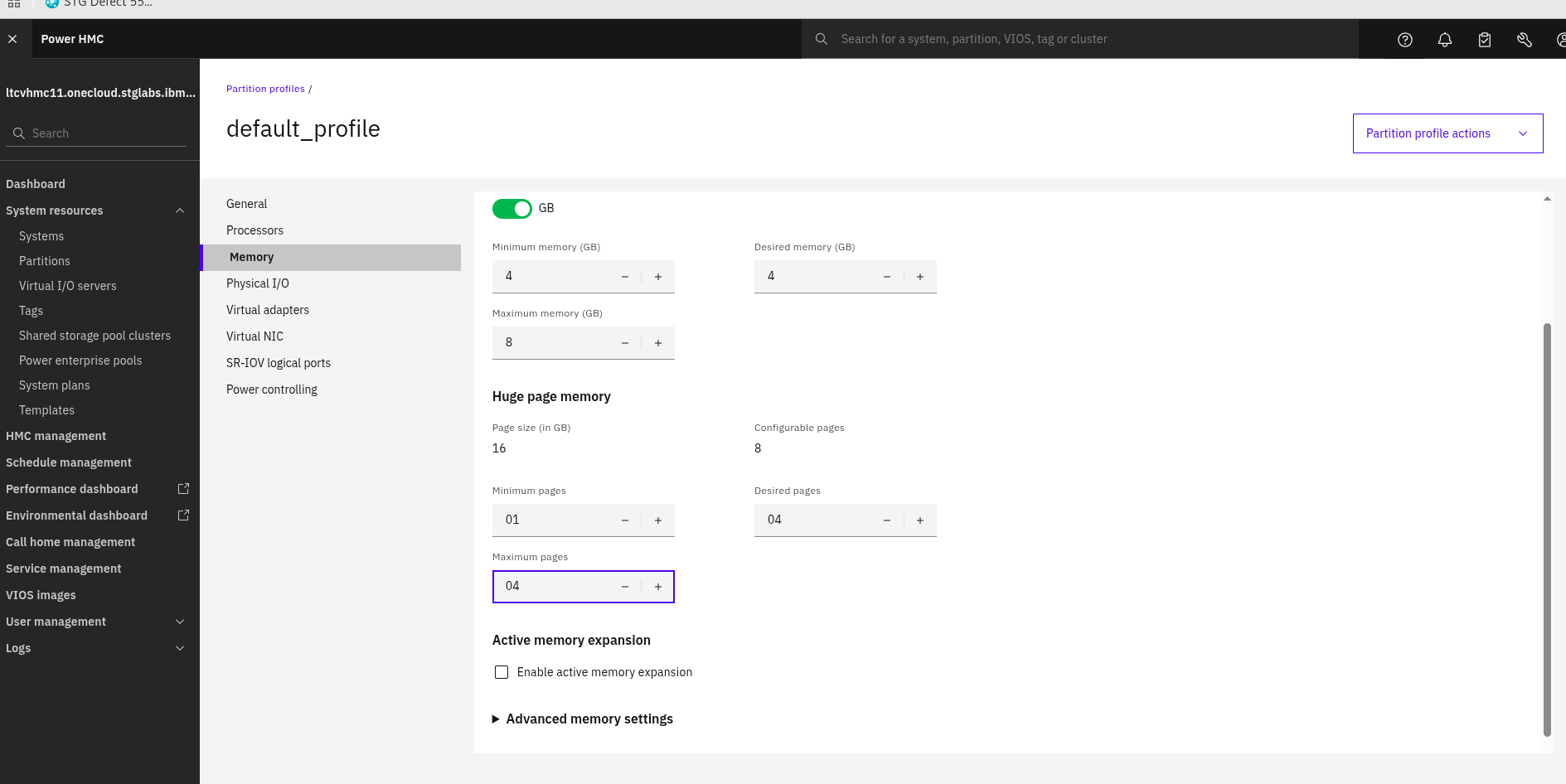 2. Update HMC LPAR profile with number of 16GB hugepages