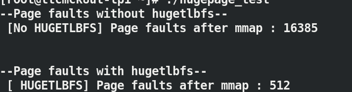 Below is the output of a sample program which shows two different scenarios one without and one with hugetlbfs, with hugethbfs the significantly lower number of page faults demonstrates that hugetlbfs is more efficient in handling memory access, as it reduces the need for disk I/O and improves overall performance.