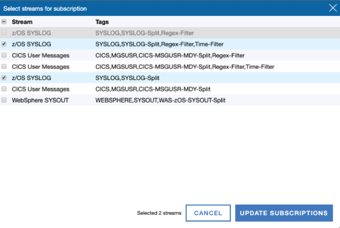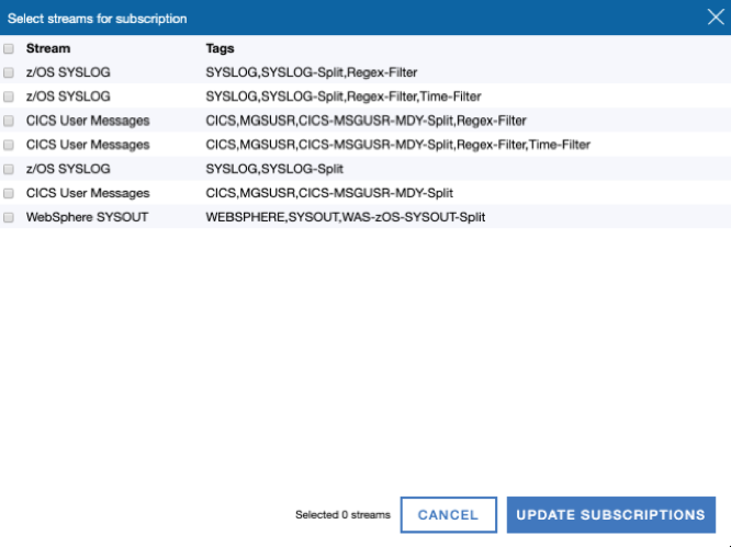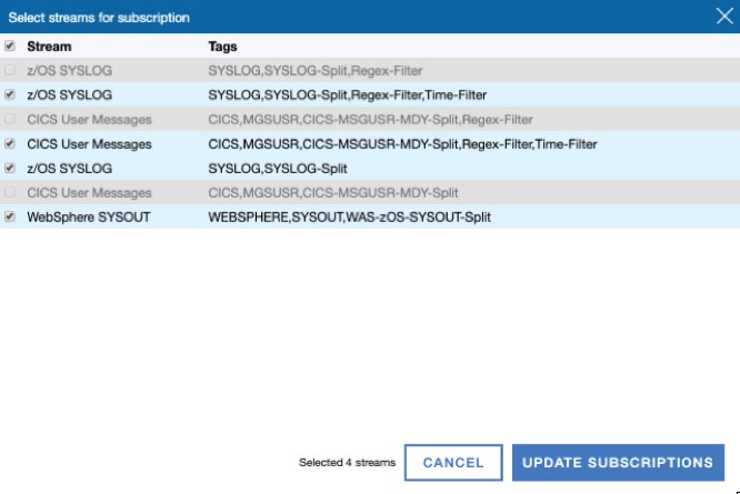 Figure 4 Shows the “Select stream for subscription” dialog after you click the “Subscribe” icon on the subscriber box. The “z/OS SYSLOG” subscriptions are selected. For “CICS User Messages”, all three options are available and unselected. For “WebSphere SYSOUT”, there’s only one option and unselected.
