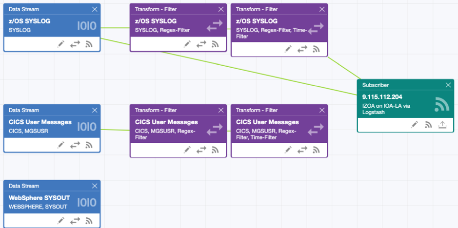 Figure 3 shows a sample policy with three data streams added to the canvas. For “z/OS SYSLOG” and “CICS User Messages”, there are transform filters added. And there are two existing subscriptions, one is between “z/OS SYSLOG” and the subscriber, the other is between the “z/OS SYSLOG” with regex and time filter and the subscriber.