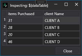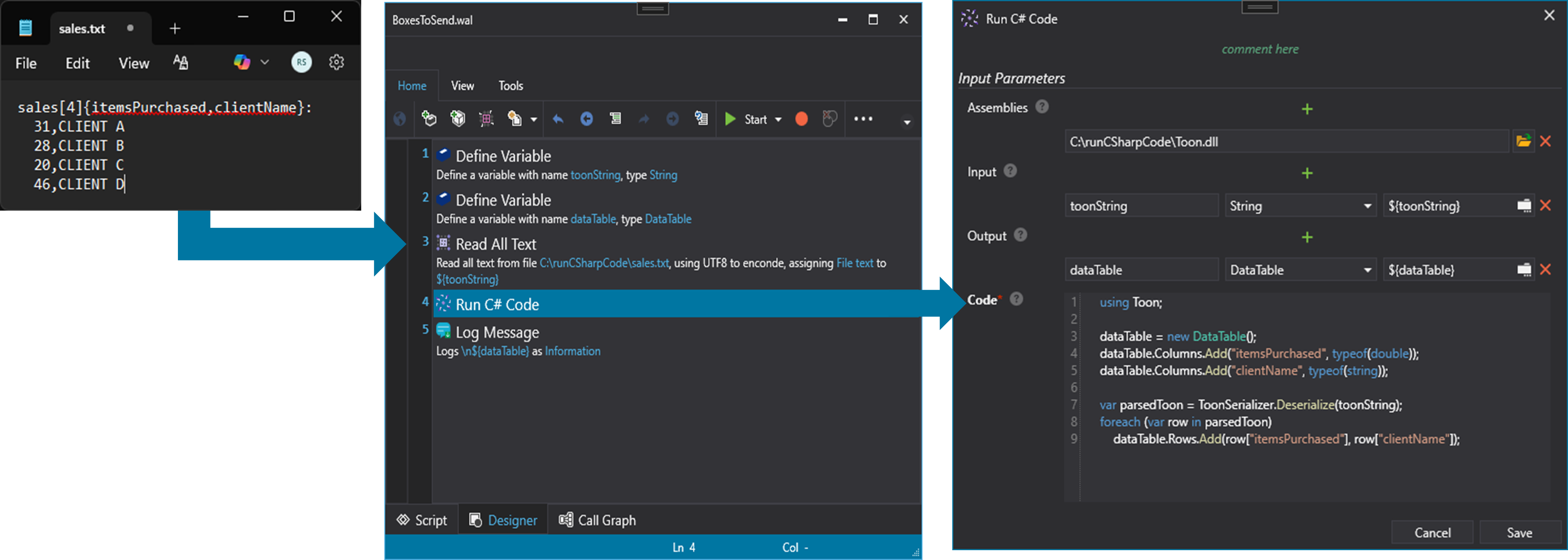 Then we use the runCSharpCode command to import the Toon.dll library, which I had previously created, and in C# code, I initialize the output variable "dataTable". I add the columns with the same name as the fields in the TOON file (itemsPurchasedd, and customerName). I finish the C# code with a loop that adds the records found in the file to the dataTable that can also be read by RPA.