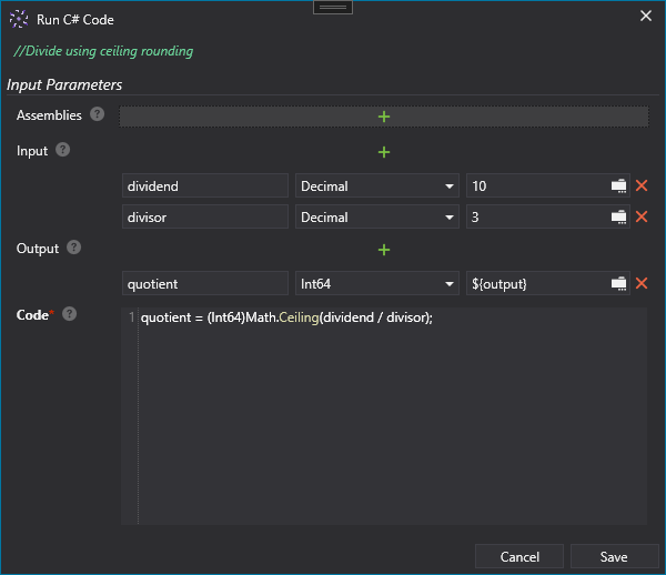 Here you enter the C# code to be executed. only the code, no class definition is required, no access modifiers (public, protected, private), and the variables entered in the Input and Output fields are already part of the code and do not need to be declared again. In addition, some namespaces are already loaded automatically: