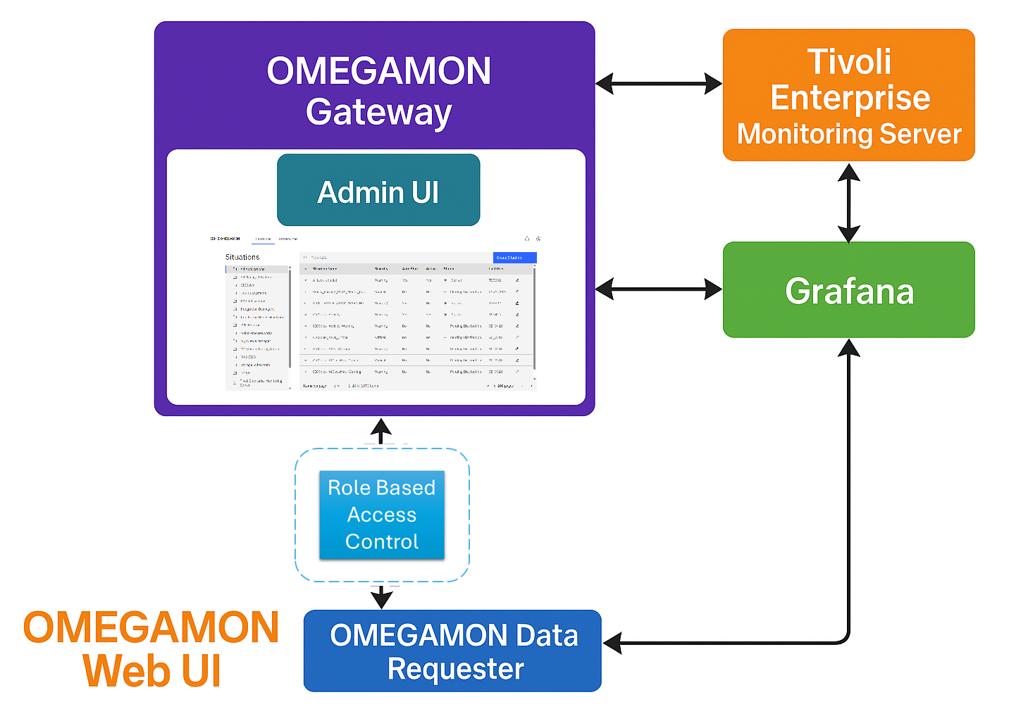- OMEGAMON Data Requester: Retrieves and processes monitoring data for both real-time and near-term data analysis, enabling advanced queries and visualizations.