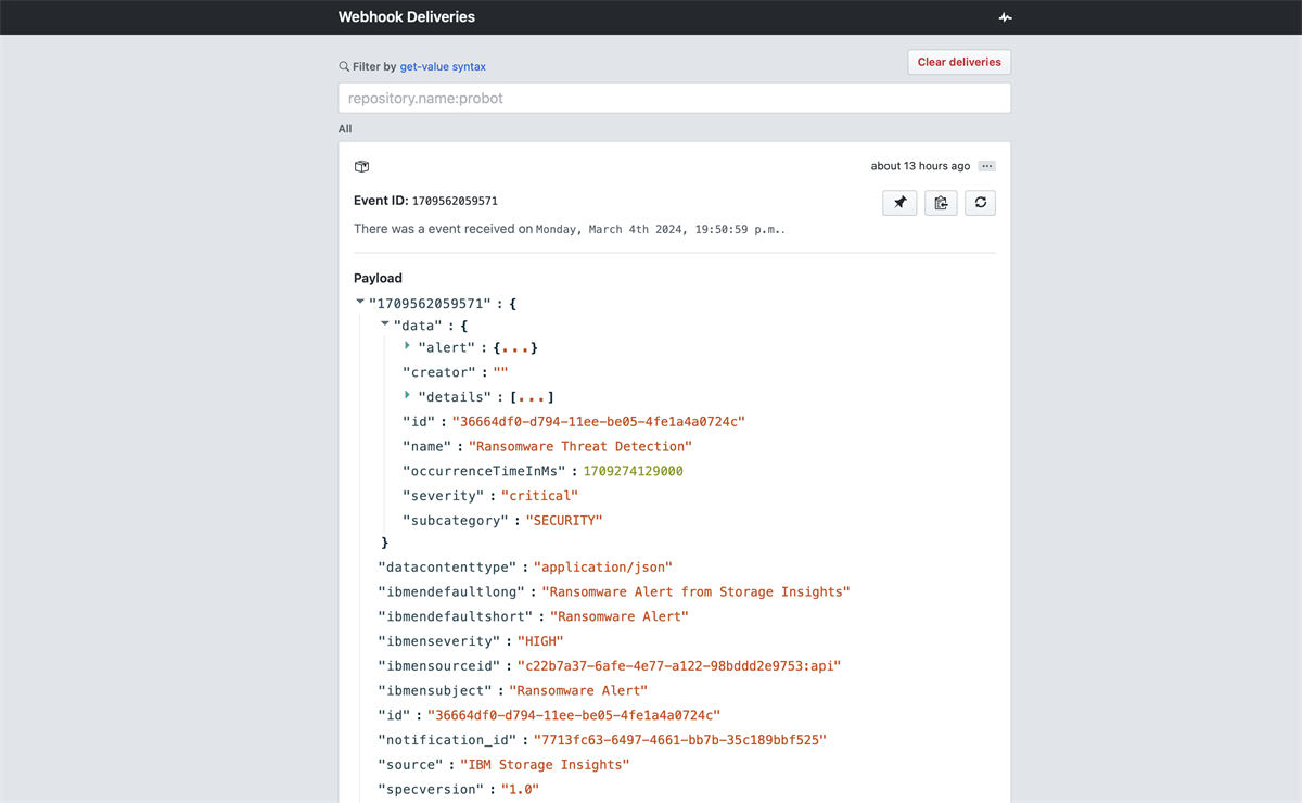 When the event publisher publishes an event to the IBM Event Notifications, it is configured to invoke a Webhook that was declared while provisioning resources. To test Webhook deliveries, we can use