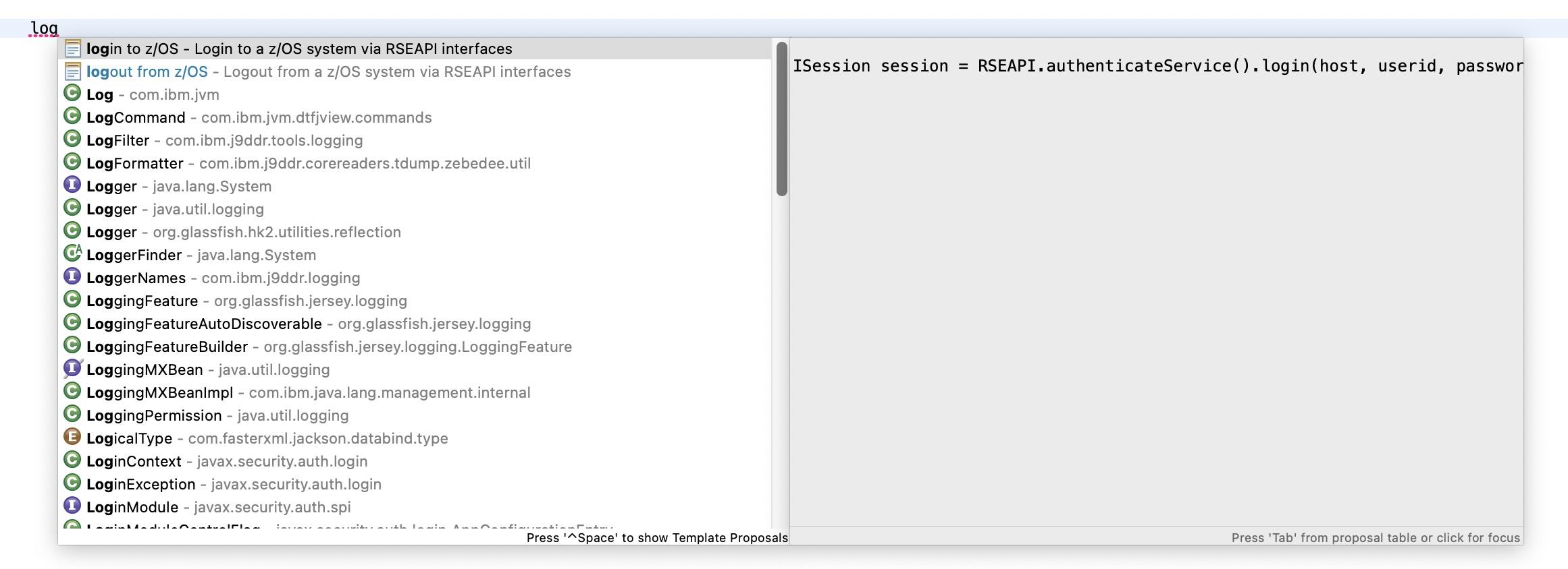 You can write almost the entire application using just content assist and code completion. To make things even simpler, IDz provides a set of code templates for some of the most common tasks. Code templates can be accessed the same way as content assist. Instead of just inserting a single line of code, code template function inserts a snippet of code that performs some of the common tasks. For example, if you type “log in” and invoke content assist, you will see the following template. The code template function inserts the code to log in to a z/OS server and all the required imports.