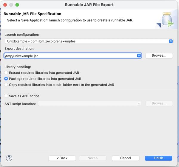- In the Runnable JAR File Export dialog, select the launch configuration and export destination.