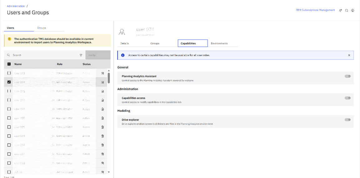 As an environment/subscription administrator, simply enter the Users and Groups section of Planning Analytics Administration. Select the user you want to configure the Planning Analytics Assistant for and under the Capabilities section you will find the ability to enable/disable the Planning Analytics Assistant via the capability toggle.