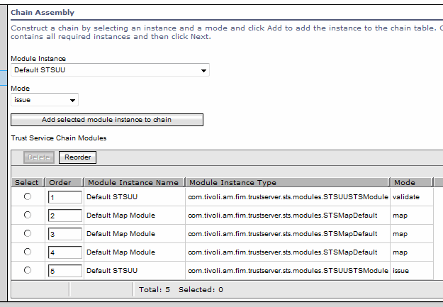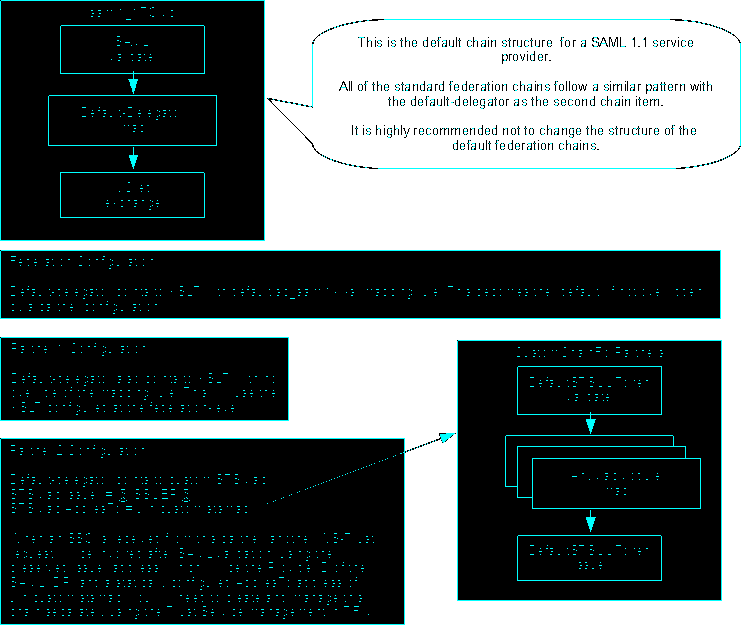 - Any modification to the chain structure of an SSO chain that doesn’t preserve ALL of the existing modules in the chain will break the console when trying to display federation or partner properties. Using our example of a SAML 1.1 Service Provider, the built-in chain has the identifier saml1_1TOivc and the structure is SAML(validate)->DefaultDelegator(map)->IVCred(exchange). The default delegator is actually a module that points to your real mapping module instance (XSLT, Javascript, TDI or custom Java module) via configuration based on what you select for the Identity Mapping Module in the federation or partner wizard in the console. If you remove any of these from the chain, the console will not work properly when managing the federation or partners.