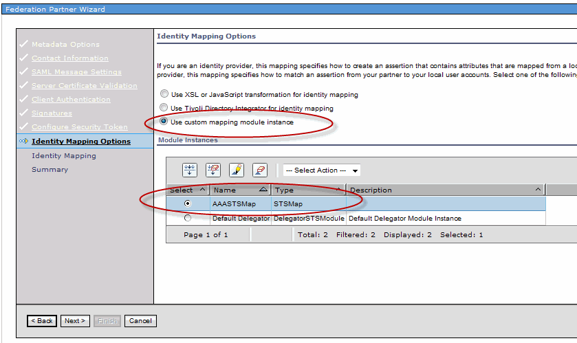 Now when configuring your SAML partner properties in the TFIM Console, select the Custom Module as the Identity Mapping Module: