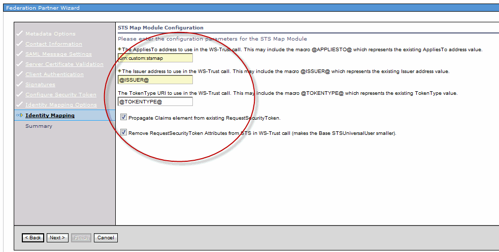 - The chain selection criteria (Issuer address, ApppliesTo address, etc) must match with the configuration you’ve performed for the STSMap module in the federation or partner configuration