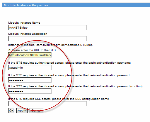 Now use the TFIM console to create a module instance of the com.tivoli.am.fim.demo.STSMap module, and set the init parameters for your module instance to point at the STS where you will configure the secondary chains. This will typically be the same STS as your federations, so the default URL of http://localhost:9080/TrustServer/SecurityTokenService will normally be ok. There are options available for basic-authentication and SSL configuration if needed. These options have exactly the same meaning as the properties for the STS client that is shipped as part of WSSM for TFIM and configured in the WSSM.properties file. If they don’t seem obvious, you can read more about them in the InfoCenter here. You may also need to modify the role to user/group mapping for the TrustClientRole and TrustClientInternalRole of the ITFIMRuntime application in order for the module to be able to connect to the STS. Information about that requirement is documented in my blog article Using CURL to send requests to the TFIM Security Token Service.
