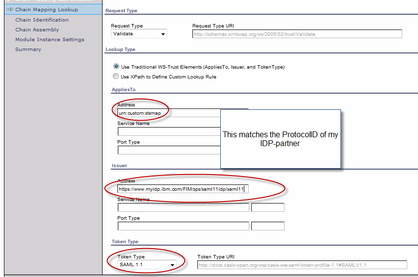 Here is an example of the chain selection criteria which matches the SAML 1.1 IDP-partner that we’ve been using for illustration purposes: