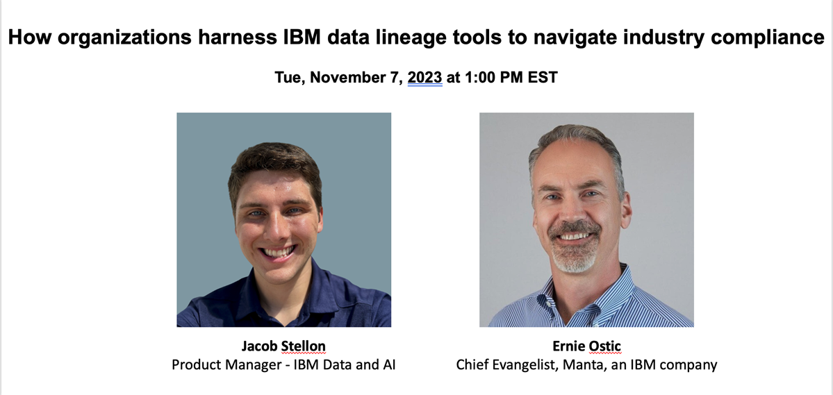 In this webinar, product managers from IBM and Manta, an IBM company will discuss common regulatory standards in different industries, the financial risk of non-compliance, best practices and necessary tools like data lineage to keep pace with a dynamic regulatory environment. We will talk about how the recent acquisition of Manta Software Inc, a world-class data lineage platform, can help complement IBM’s data and AI governance capabilities.