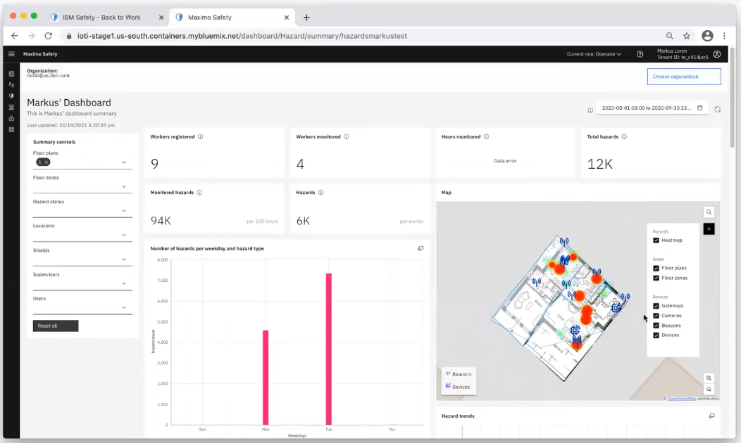 Now let's look at another new app, Safety. Imagine you are the head officer responsible for workplace safety n all your company's locations. Safety gives you monitoring and analytic tools to track and prevent hazards at each location - crowd density and social distance violations, people entering a no-go zone, people with elevated body temperatures or not wearing PPE. Safety brings these analytics together and you can zoom in on a floor plan that highlights detected hazards in a heat map.