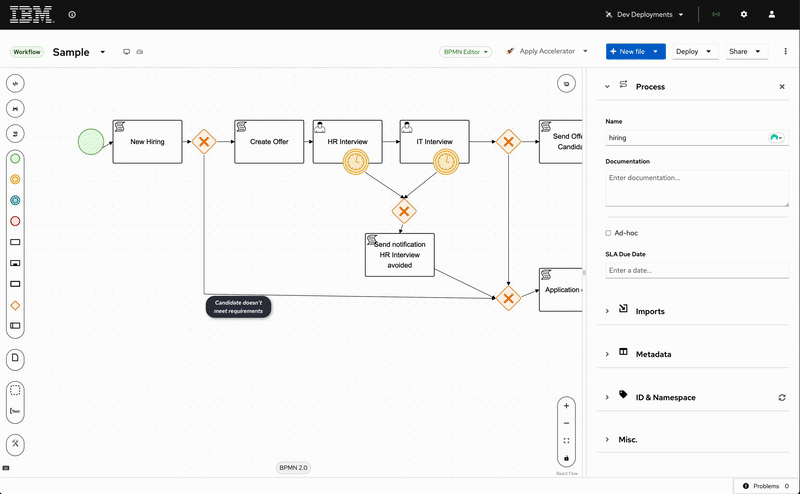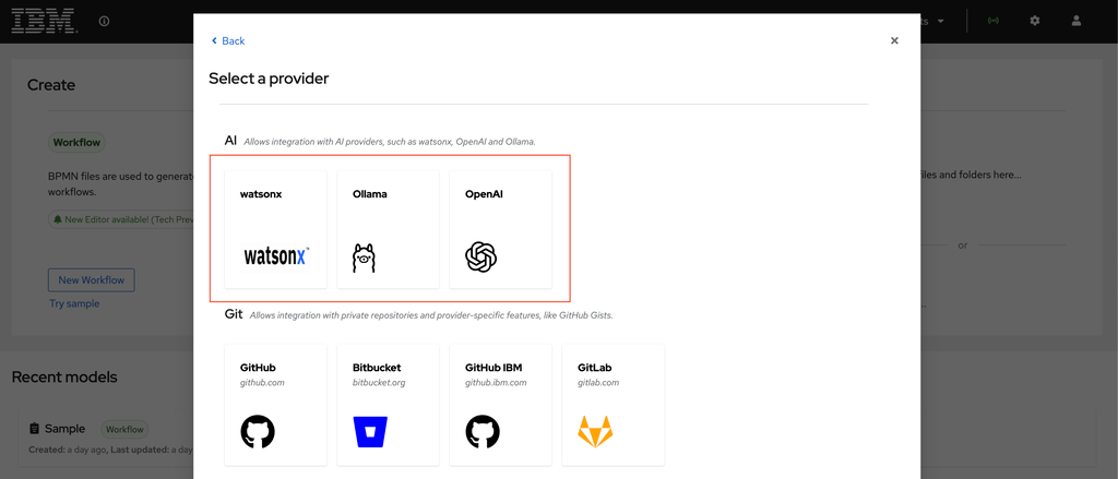 When authoring BPMN models, you can connect to your desired AI provider to list available models and preview prompts with simulated variables. We currently support IBM's watsonx.ai, OpenAI, and Ollama as providers.