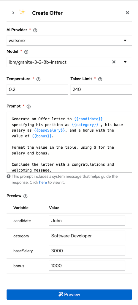 If you are connected to the selected AI provider, the Preview button should be enabled. The preview allows you to mock data for the process variables and check the result of the prompt, providing insight into how it would behave during execution.