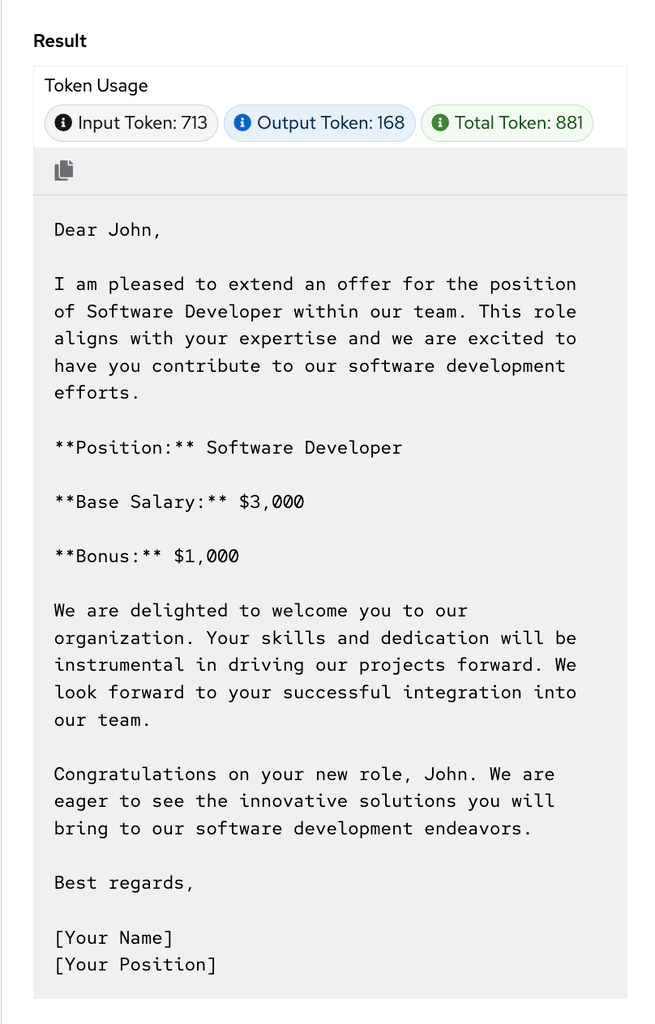 Fill in temporary values for the variables in your prompt, run it, and see the actual output from the provider and model you selected. This is useful for checking length, tone, and structure before deploying. Adjust the prompt, temperature, or token limit as needed, then re-run.