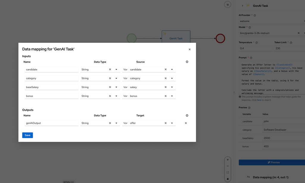 Starting from BAMOE 9.3.0, we've added a generative AI task to our workflow tooling and runtime. It’s a task node you can drop into a BPMN model like any other. It runs prompts against an LLM and reads/writes to your process variables. No side services or custom glue code needed.