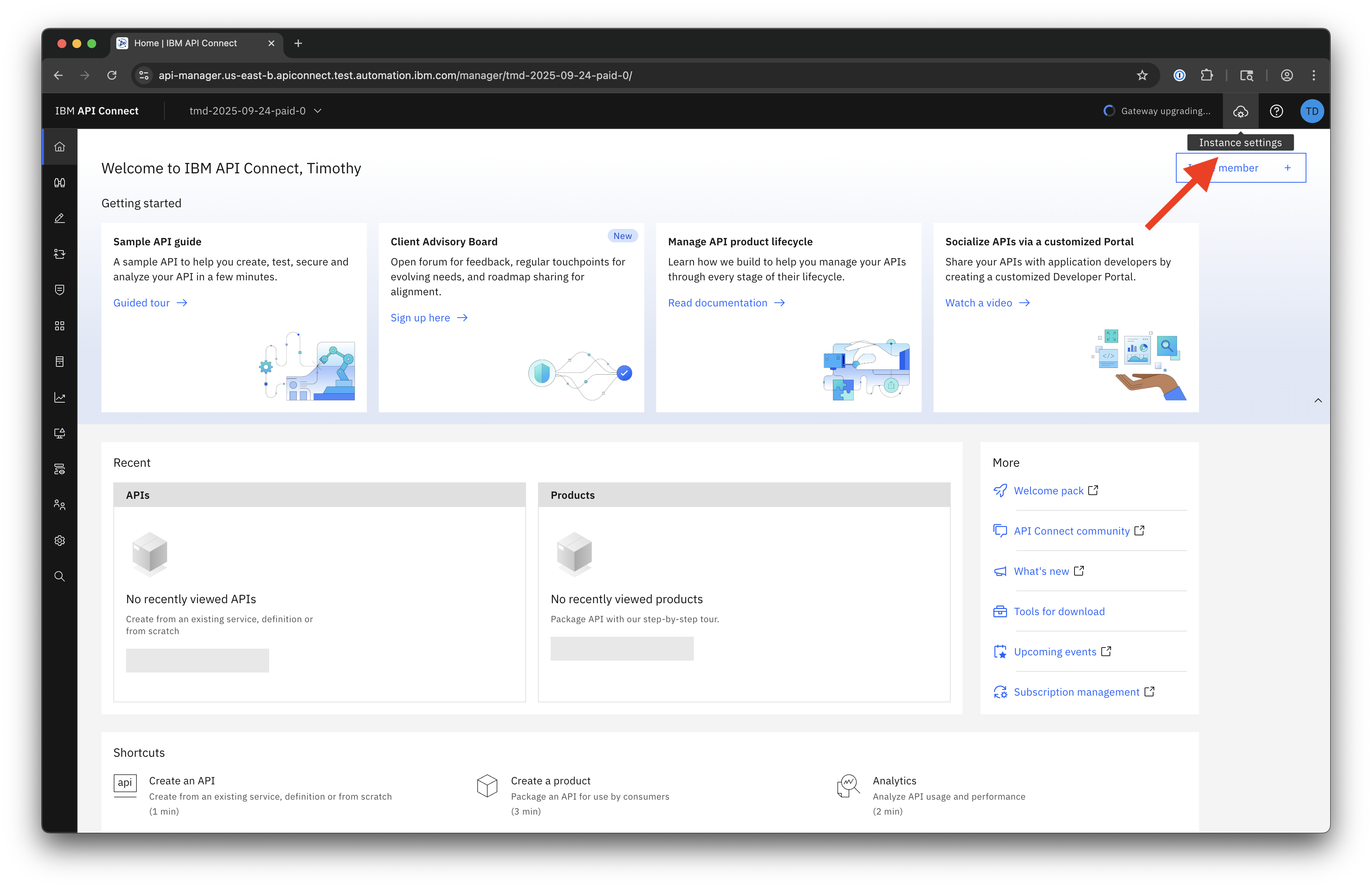 To begin, open the Instance settings panel in the top-right after logging in to your Service Instance.