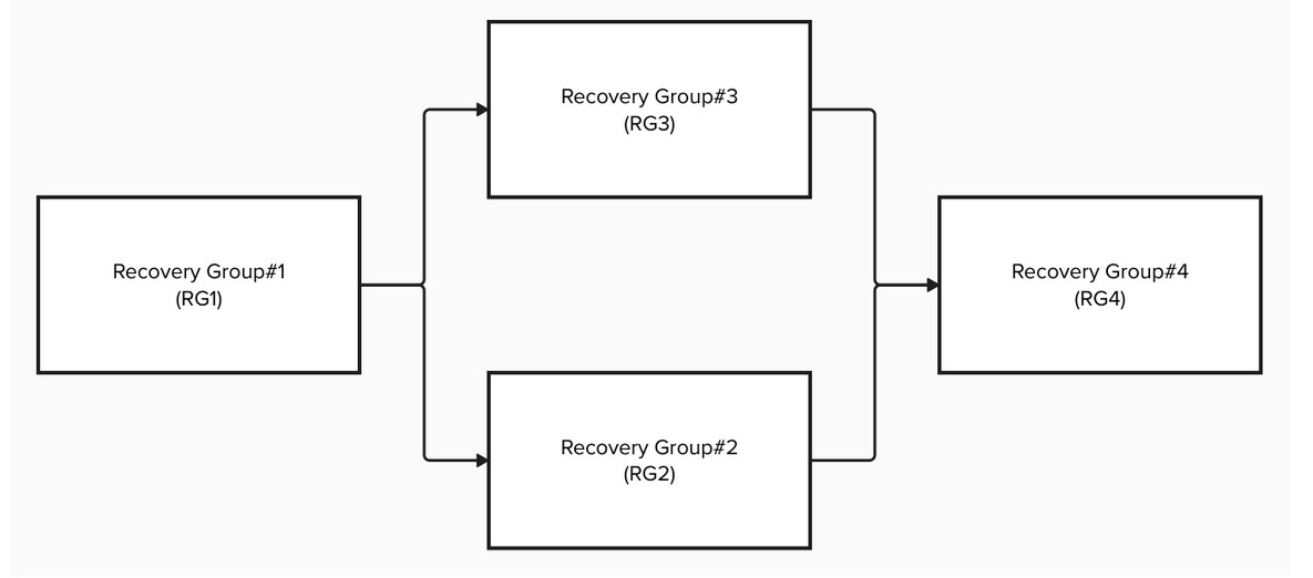 This also helps define and represents an order of operations, to recover the entire application. A recovery group can be a pre-requisite for another recovery group within the application. E.g., in the above diagram, RG1 needs to be recovered first, followed by RG2 and RG3 in parallel and RG4 at the end.