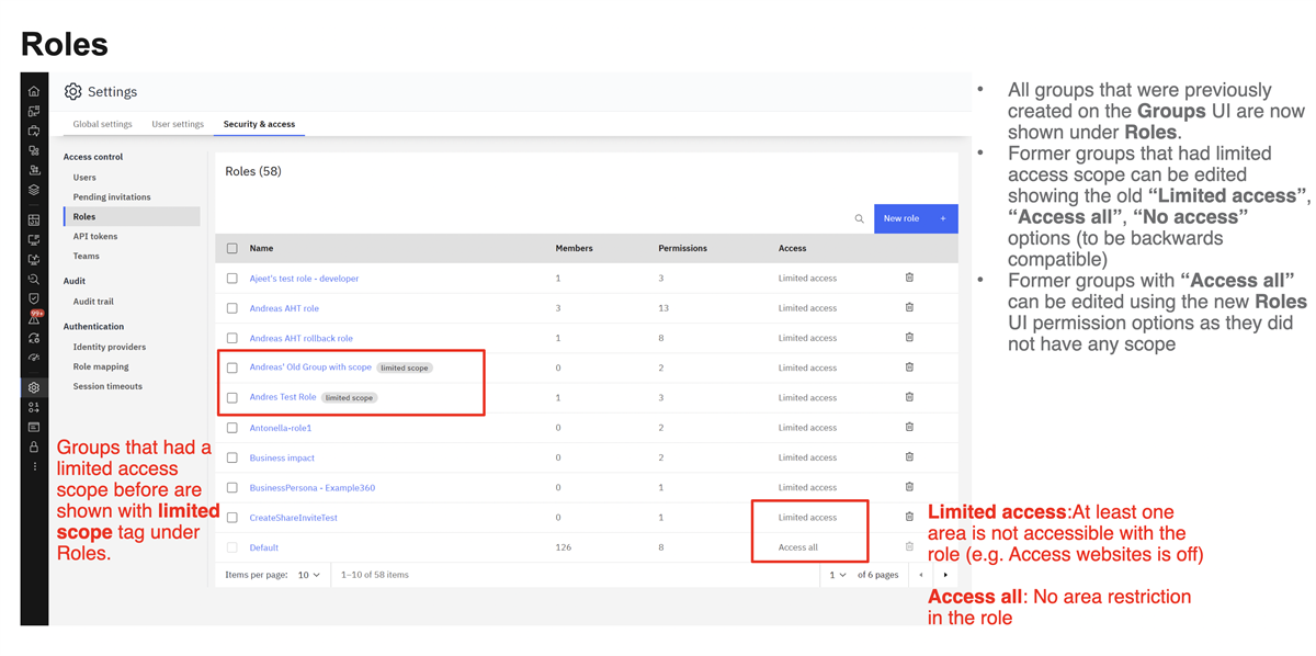 All existing Groups continue to function as Roles, ensuring backward compatibility. Groups with full access are automatically converted to Roles with the new permission model, maintaining all their original capabilities. Limited Groups are converted to Roles with limited scope and remain editable, though it's strongly recommended to migrate these limited scopes into new Teams for better management and flexibility. Additionally, the previous Group mapping functionality is replaced with Role mapping, with the option to add Team mapping for more granular control over user access.
