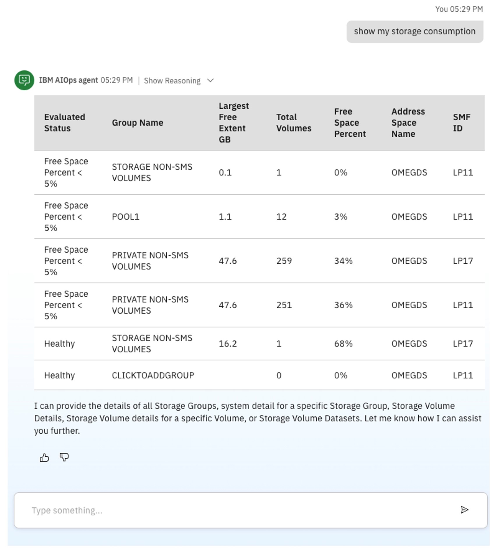 Here is another example, in which a chat user asks, “Show my storage consumption”. The OMEGAMON insights agent interprets the request and makes the appropriate API call against OMEGAMON for Storage to display a formatted table of storage groups along with key metrics such as free space percentage and the evaluated overall status: