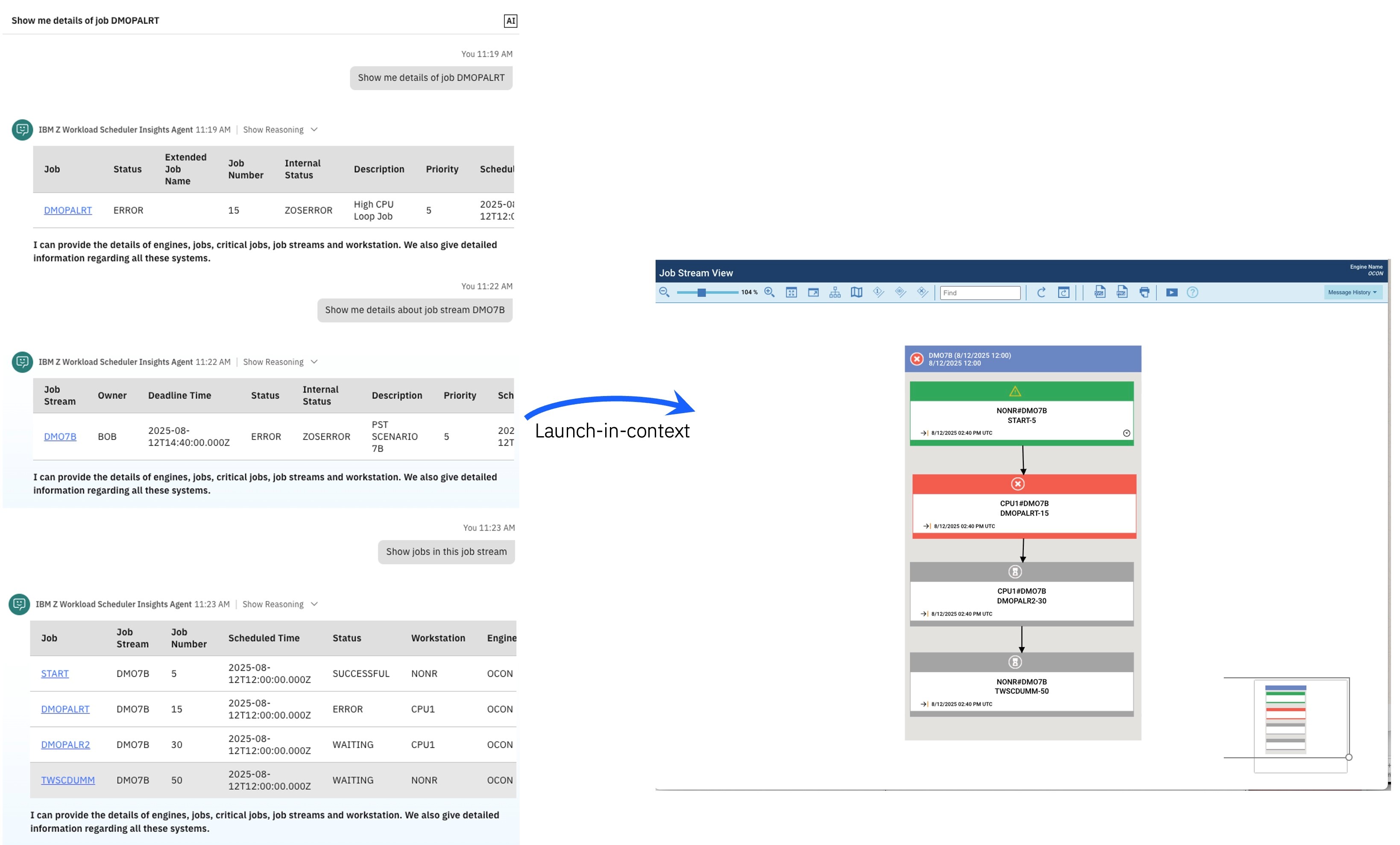 The Dynamic Workload Console not only provides the APIs to communicate with the Z Workload Scheduler backend but also provides graphical job stream views to which you can launch to in context from output provided by the AI agent.
