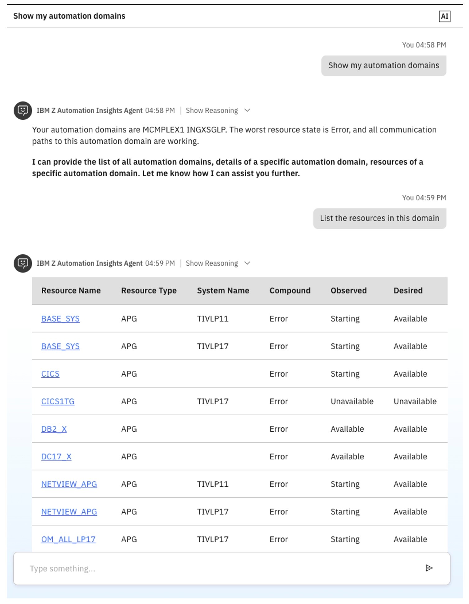 These agents provide real-time operational insights into subsystems monitored by IBM Z OMEGAMON, applications and systems managed by IBM Z System Automation and IBM Z NetView, and batch jobs orchestrated by IBM Z Workload Scheduler. Through natural language interaction, users can pinpoint issues and bottlenecks from a single interface.