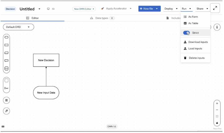 DMN 1.6 introduces a key enhancement that simplifies how InputData values are assigned across models with nested or transitive imports during model evaluation. In such cases, the value is now assigned only once. This means that even if multiple models refer to the same input data through different import paths, they will consistently share the same value.