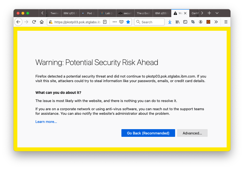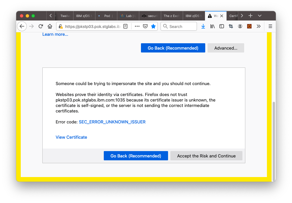 If you trust the z/OSMF URL you are connecting, click the “Advanced” button and click the link “Proceed to HOSTNAME (unsafe)”