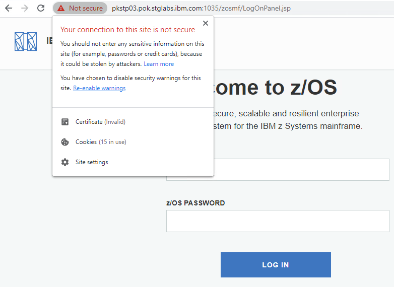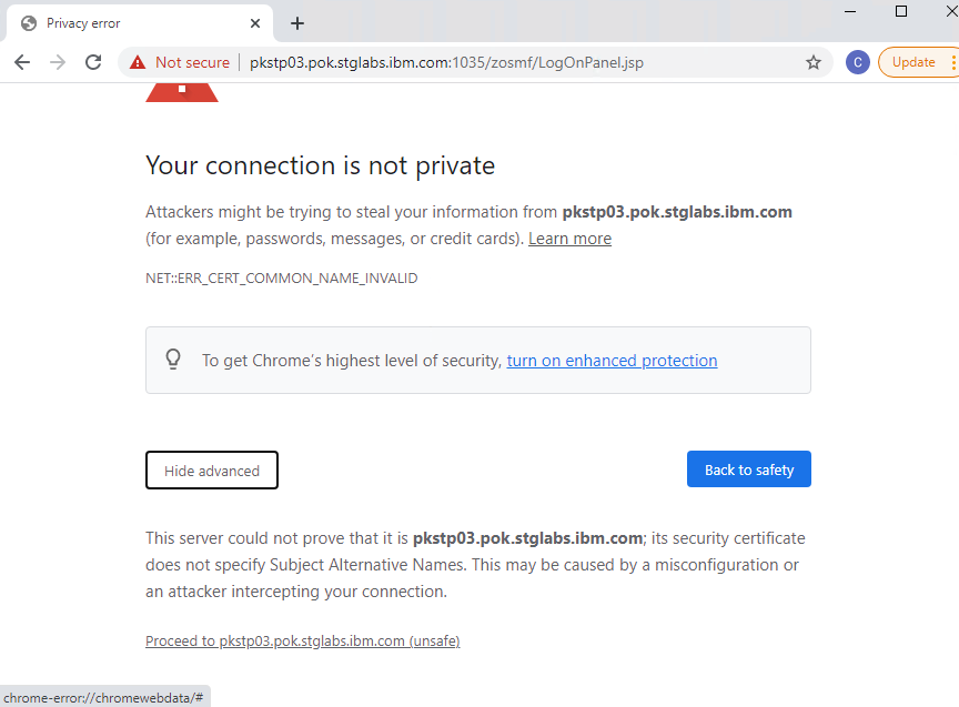 When connecting to z/OSMF, you might see a warning message “Your connection is not private” in your browser. Along with this message, the browser also provides a reason code like NET::ERR_CERT_INVALID for your reference. Many people have seen this message and have clicked the “proceed to HOSTNAME (unsafe)” link directly without knowing what it means. The message won’t be shown since next time you visit z/OSMF in the same browser.