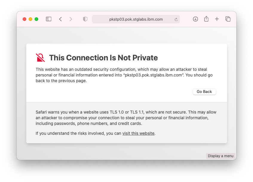 On Safari, when you open z/OSMF by the first time, you might see the message “This website has an outdated security configuration, which may allow an attacker to steal personal or financial information”. This message isn’t always true. Even the server supports TLS 1.2 which is not out dated, you might still see the message when MacOS doesn’t trust the CA certificate that signs your server.