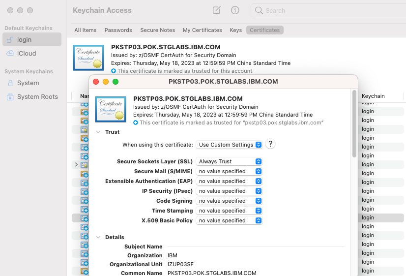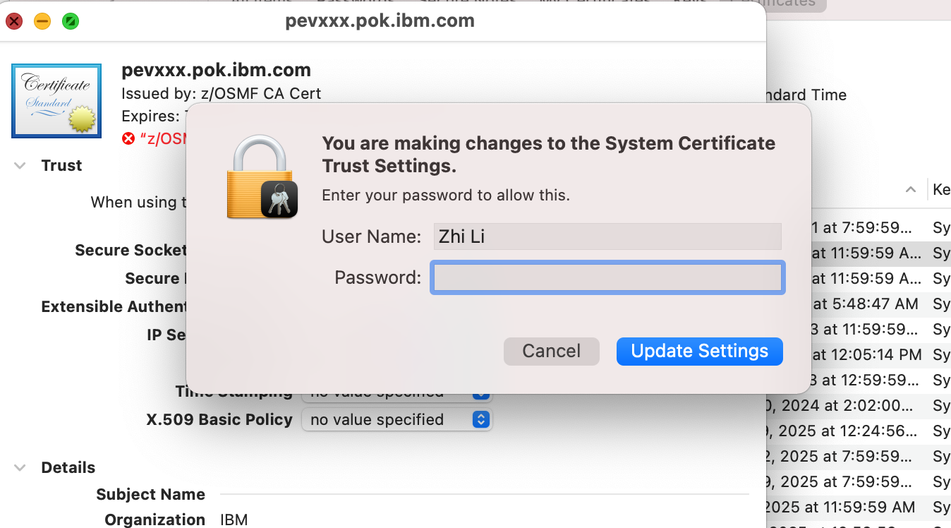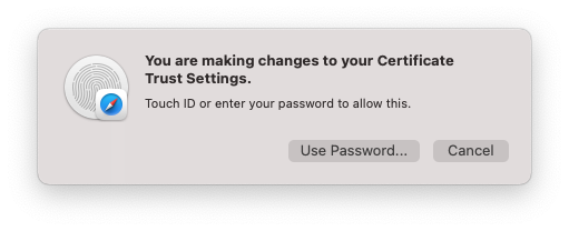• Close the popup windows. MacOS will ask you input your username and password to modify the Trust Settings.