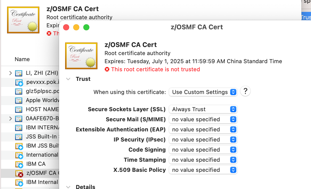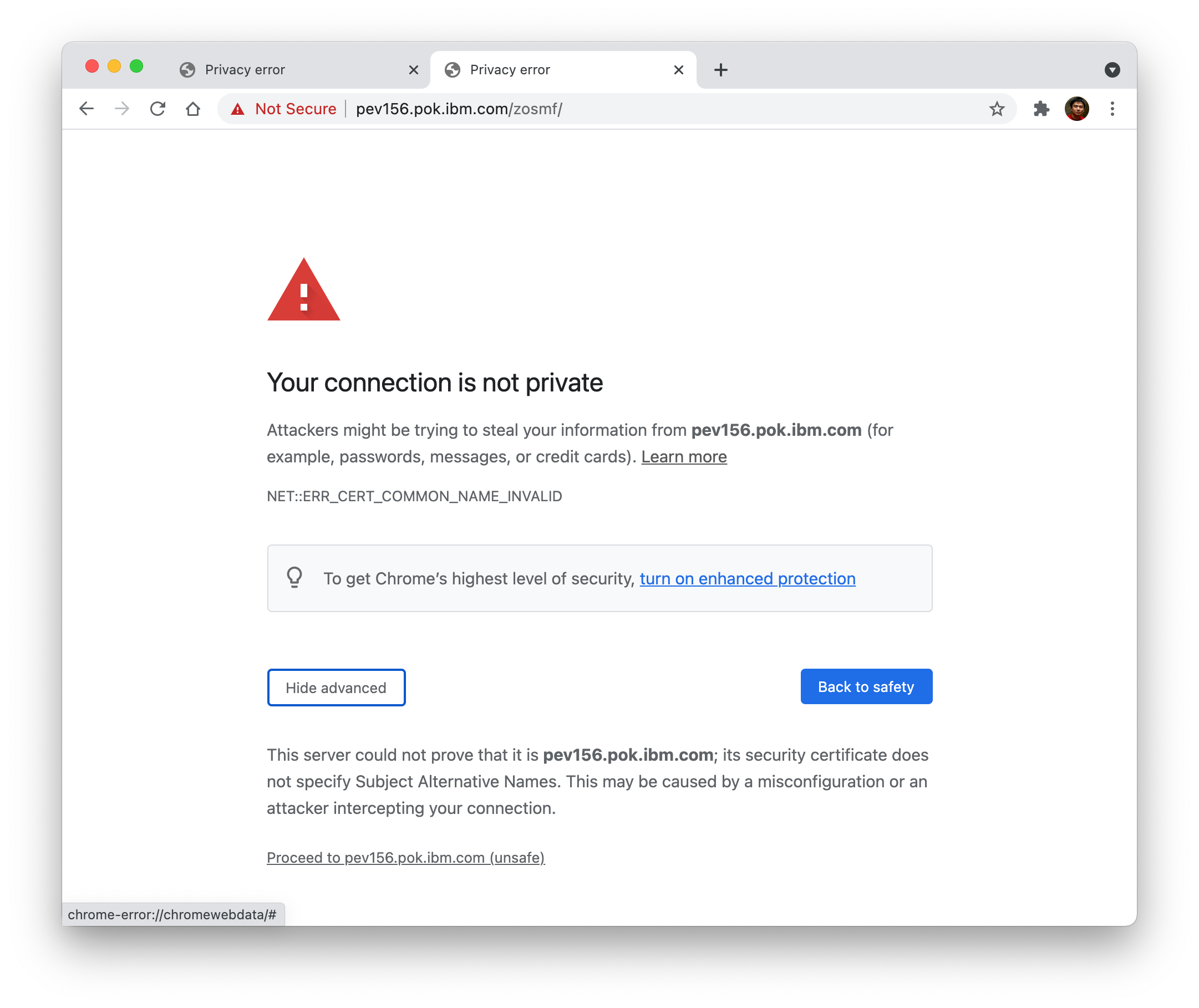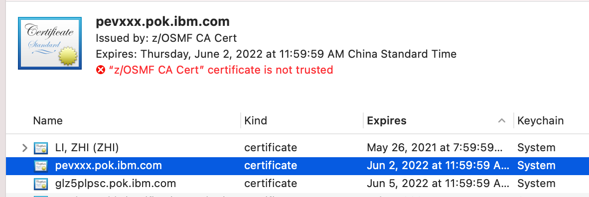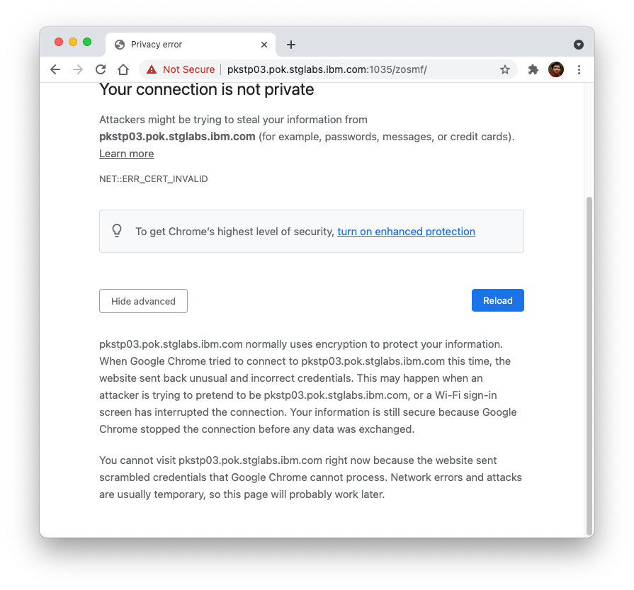 The most common reason you see “Your connection is not private” is because the certificate of z/OSMF server is not trusted. And the most common reason that the server certificate is not trusted is because the CA certificate that signs z/OSMF server certificate is not trusted by your browser or operating system.