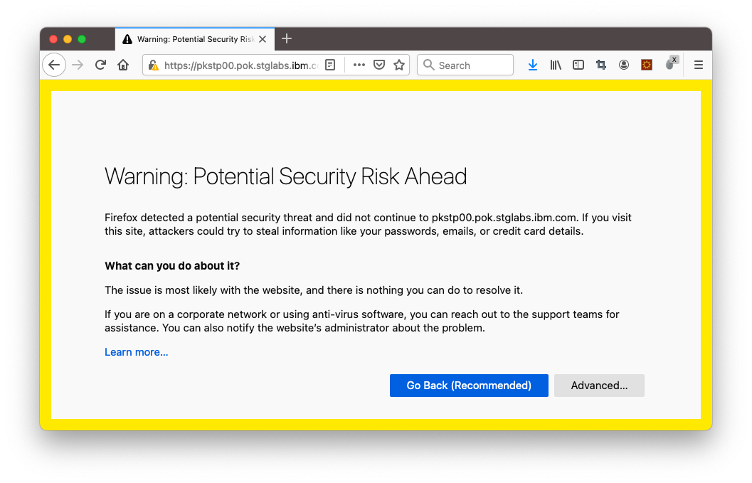 If you confirm that the URL you are connecting is correct and is trusted, you can click the “Advanced…” button. Then a new button “Accept the Risk and Continue” will be shown.