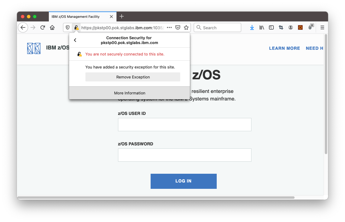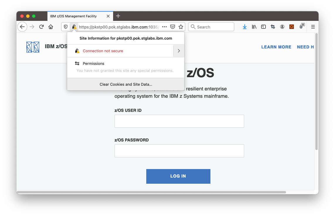 If z/OSMF is loaded in your browser, click the lock button in Firefox Address bar. On the popup window, click on the “>” arrow next to “Connection not secure”.