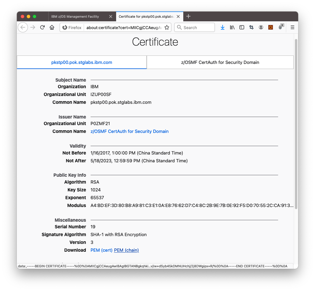 You can also export the CA and server certificates from RACF. Due to the complexity and special authorities required on z/OS, it’s recommended to use Firefox to download the certificates as the primary option.