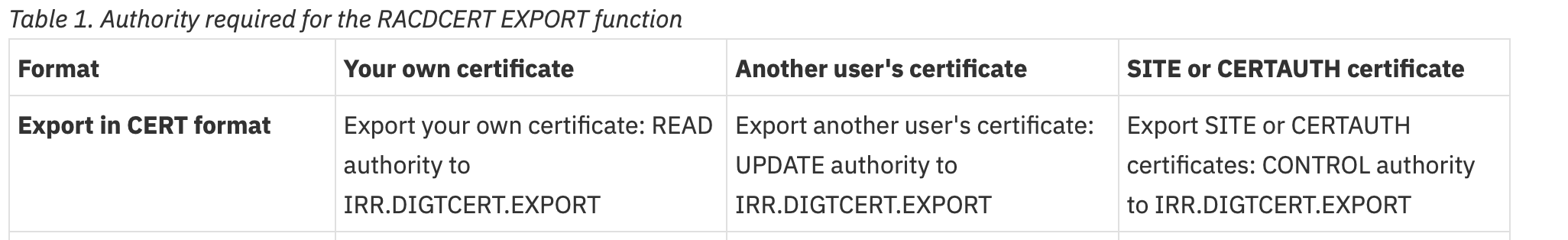 RACDCERT EXPORT(LABEL('DefaultzOSMFCert.IZUDFLT')) ID(IZUSVR) DSN('CERT.IZUSVR.DER') FORMAT(CERTDER)