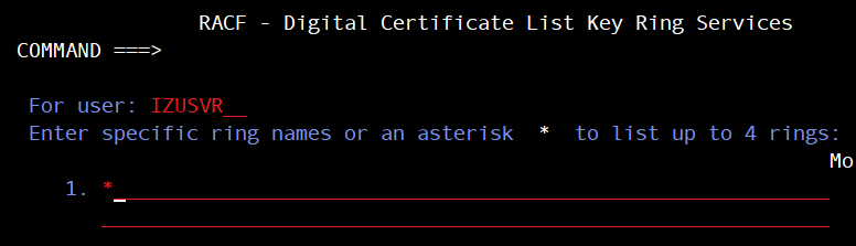 • then select 3 List existing key ring(s). Input your server ID in For user: _________ . Your server ID (started task ID) can be checked in SDSF panel. It’s default to IZUSVR. Your z/OSMF administrator might have customized this value