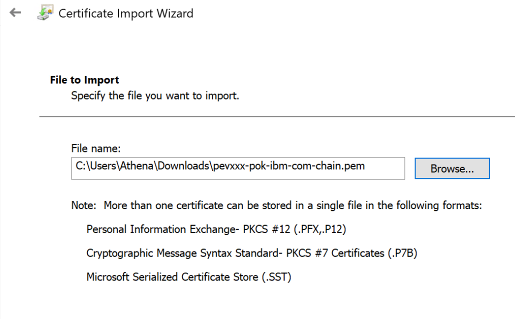 • On the File to Import panel, select the certificate you downloaded. If you have downloaded CA and server certificate in a chain, you just need to import the chain certificates once.