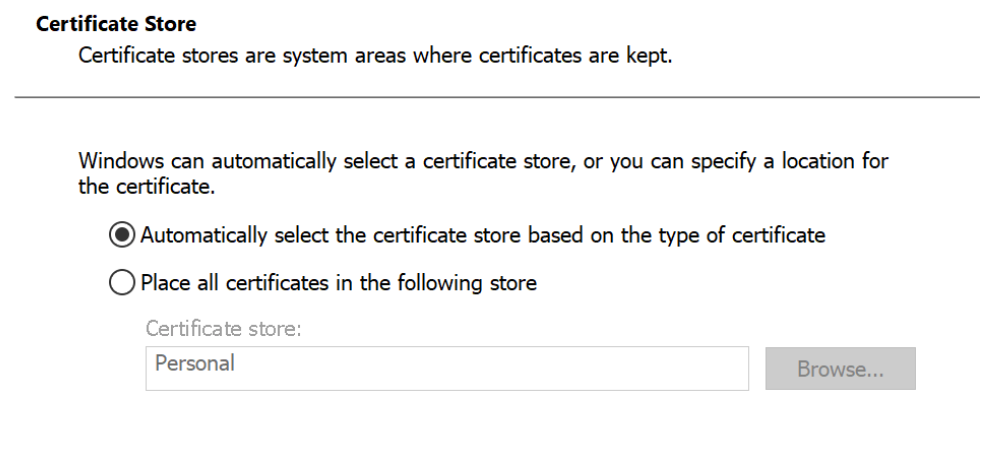 • On the “Certificate Store” panel, select “Automatically select the certificate store based on the type of certificate” and click “Next”