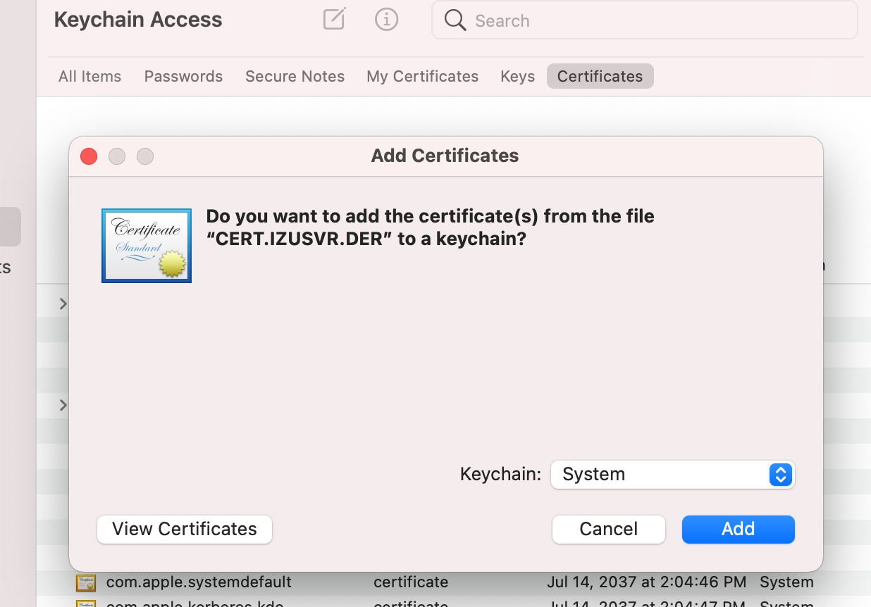 6. Once authenticated your user, select “System” Keychain and click “Add”